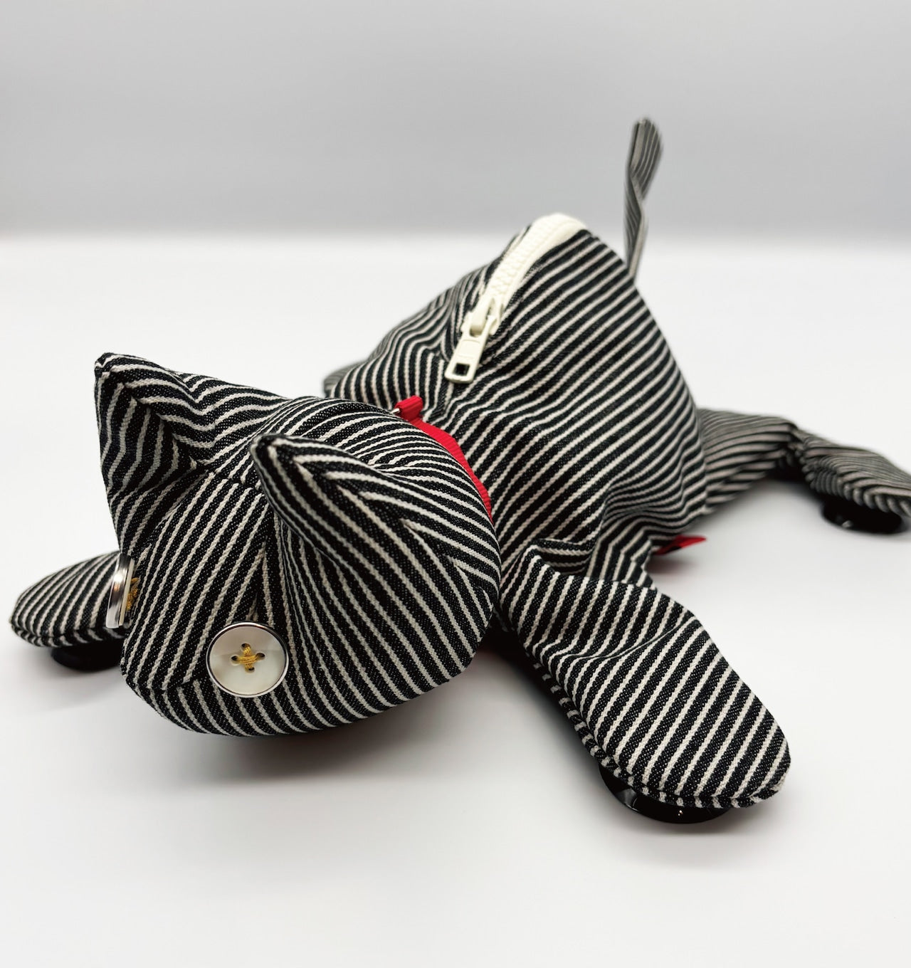 猫型タンクバッグChat noir “UNA”をワークウェアなどに使用するヒッコリーの生地を使って制作致しました。